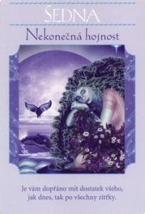 O Sedně: Je to inuitsko-eskymácká a aljašská bohyně moří, která opatřuje potravu pro tělo a mysl. Šedna přišla o konečky prstů při tragické nehodě na lodi a tyto články prstů se přeměnily na velryby, tuleně a jiné mořské tvory. Díky tomu je Šedna neoddělitelně spjata s obyvateli oceánů. Poproste ji o pomoc s přílivem hojnosti, zvláště pro svou rodinu. Šedna také může pomoci se záležitostmi, které se týkají oceánů, včetně kontaktu s velrybami a delfíny. Velmi si cení každého, kdo věnuje čas, peníze nebo úsilí na ochranu moří a mořských tvorů.