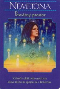O Nemetoně: Její jméno znamená „posvátný háj", protože ochraňovala dávná keltská obřadní místa, která se nacházela venku v posvátných hájích. Nemetona stále bdí nad posvátnými místy, obzvláště nad těmi, která mají spojení s přírodou. Pomůže vám postavit své vlastní posvátné místo, i s obřady šamanského kruhu nebo labyrintu.