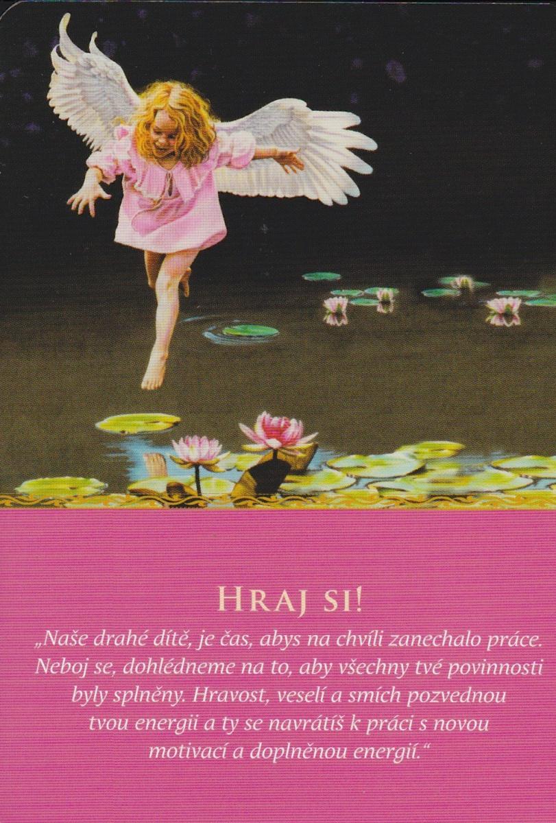 Andělé vidí, že si potřebujete hrát a proto vám posílají tuto kartu.V poslední době jste jen pracovali a měli hodně starostí a vaší duši chybí legrace a smích. Pocit únavy, podrážděnosti nebo deprese jsou dalšími příznaky, že vám opravdu chybí zábava a hra. Není třeba, abyste čekali, až budete mít volno, protože s trochou legrace si můžete užít už dnešní den. Určitě si můžete dovolit pár milých pošetilostí, veselý rozhovor s přítelem nebo shlédnutí nějaké dobré komedie. Tento příklad zábavy jistě nevyžaduje mnoho času ani peněz. Zábava a hry jsou nutnou součástí života dětí i dospělých. Pomáhají nám nejen udržovat zdraví, ale také rychleji uskutečňovat naše přání a sny. Zábava patří k vyrovnanému životu.