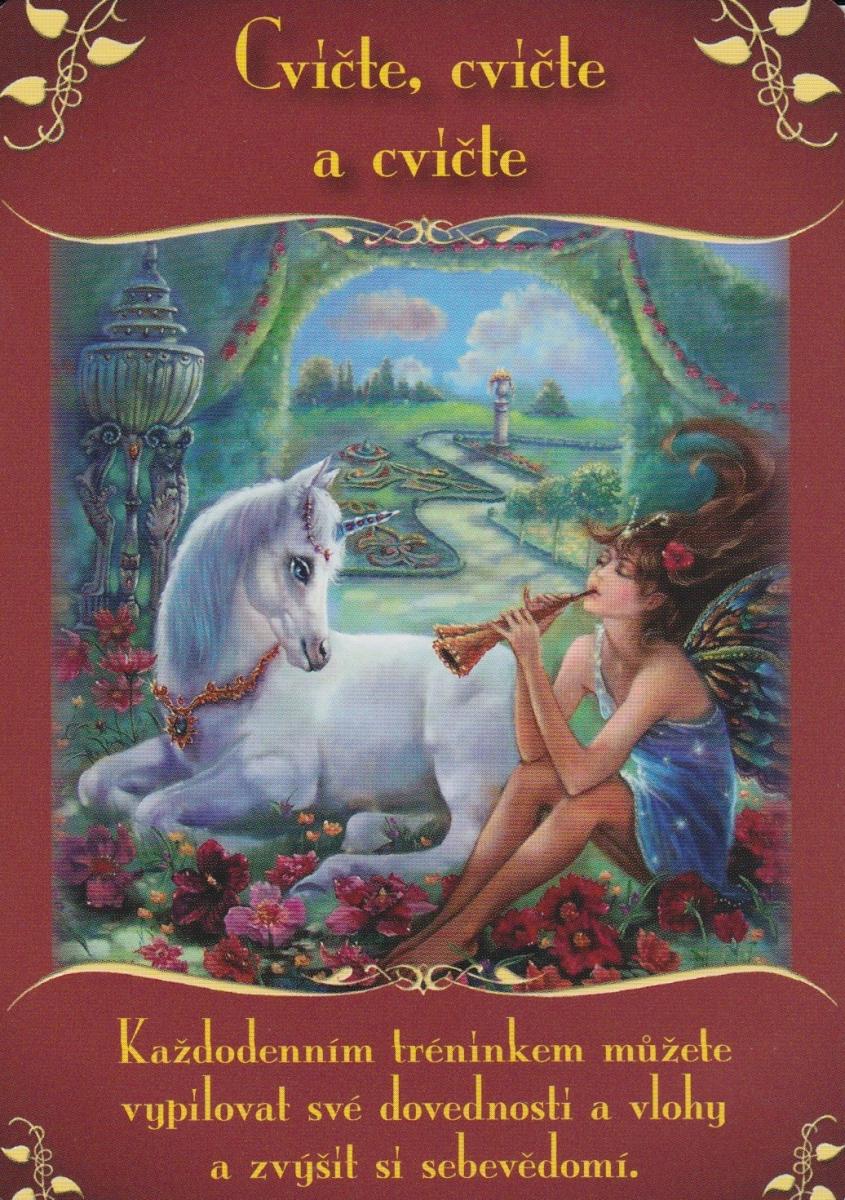 Víly milují hru na hudební nástroje a vědí, že důsledné cvičení zvyšuje jejich požitek ze hry, sebedůvěru a obratnost. I vy jste si zvolili tuto kartu, protože jste se ptali, jak něčeho dosáhnout. Odpovědí je, že máte věnovat čas každodennímu cvičení a práci na svém cíli. I pár minut denně povede k velkému pokroku – když například každý den napíšete jednu stránku, za rok budete mít celou knihu. Přinuťte se cvičit a začněte ješte dnes.