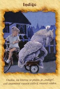Vzhledem k vaší otázce je pro vás důležité porozumět indigové povaze. Možná že vy nebo někdo jiný, koho se vaše otázka týká, je indigo nebo jste rodičem indigového dítěte. Indigo je duchovní jedinec se silnou vůlí, který pevně věří, že může přispět ke změně a zlepšení světa. Indigoví lidé jsou vznětliví, což je pohání ve snaze o aktivní proměnu světa. Tuto kartu jste si možná vytáhli proto, že vás Nebesa vyzývají, abyste indigům pomohli udržet si jejich duchovní dary a víru v jejich poslání. Mnozí z nich bývají nepochopeni a kvůli svému bleskově rychlému myšlení a intuitivní citlivosti mylně diagnostikováni jako jedinci trpící poruchou pozornosti a hyperaktivitou. Můžete jim pomoci udržovat vysokou sebeúctu a vědomí smysluplného cíle, aby tak mohli využít svá přirozená nadání ku pomoci nám všem.
