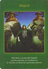 Archanděl Rafael vám pomáhá nalézt mír v neklidné situaci, proto vám posílá tuto kartu. Přijetí neznamená, že se vám musí líbit, co se právě děje, ale že se s danou situací chcete vyrovnat. Bůh a andělé slyší vaše modlitby za vyléčení. Nyní vás žádají, abyste jim celou záležitost odevzdali prostřednictvím jejího příjetí.