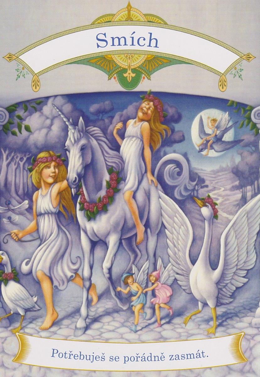 Tato karta vás žádá, abyste se v každé situaci snažili vidět něco veselého a nebrali život tak vážně. Pomocí humoru a smíchu můžete ulevit od stresu sobě i ostatním. Naučte se cítit radost, ať už se kolem vás děje cokoli. Smích a radost jsou kouzelné, protože přinášejí do vašeho života šťastné situace.