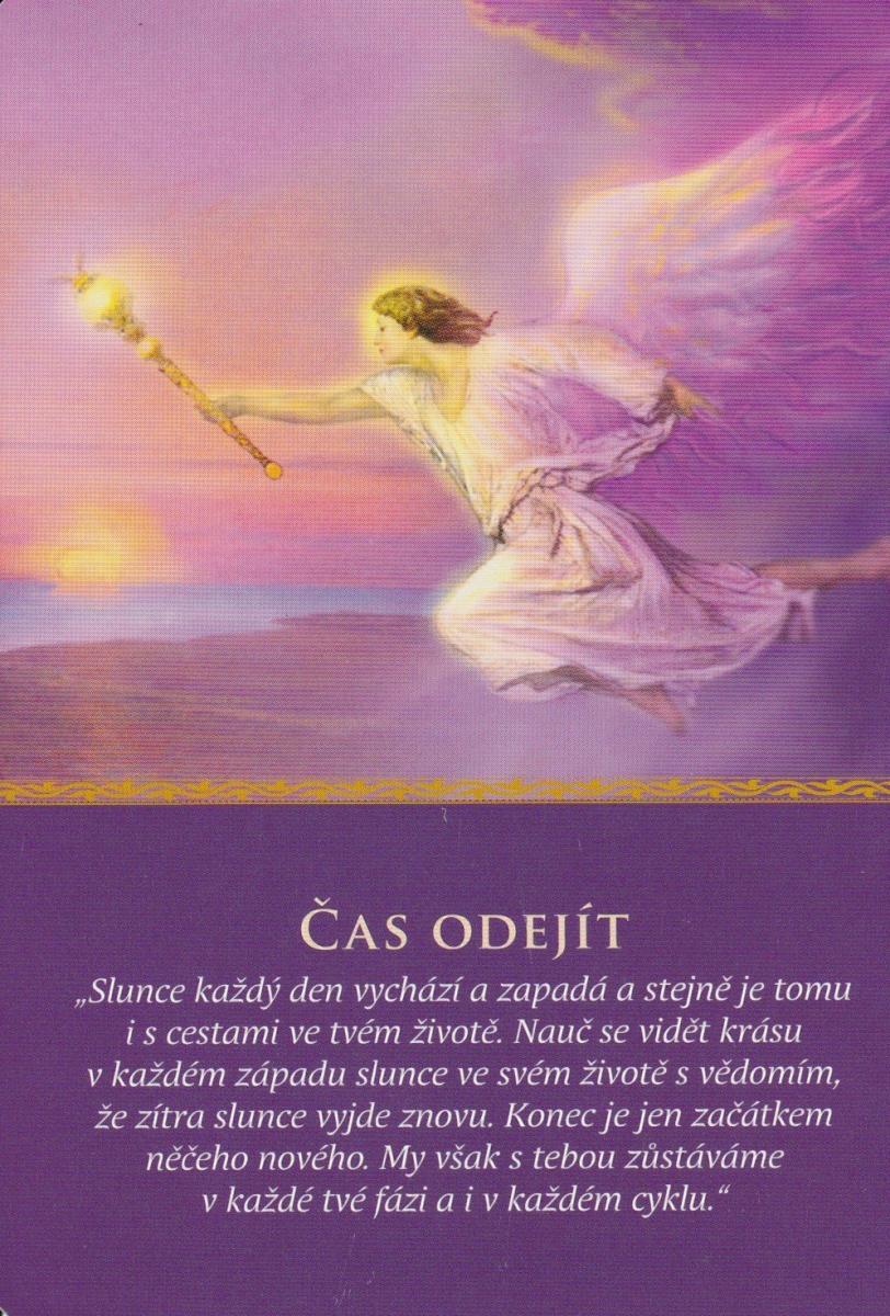 Andělé vám tuto kartu posílají, aby vám pomohli si přiznat, že je čas odejít. Vy víte, o které záležitosti andělé mluví. S odchodem jste váhali z věrnosti a ze strachu. Vaši andělé vás však ujišťují, že odchod je to nejlepší řešení. Buďte v tomto období v úzkém kontaktu se svými anděly, aby vše proběhlo harmonicky a bez úhony pro všechny zúčastněné. Všechny své negativní emoce a pocity viny odevzdejte Nebesům, protože potřebujete, aby hladina vaší energie zůstala vysoká.