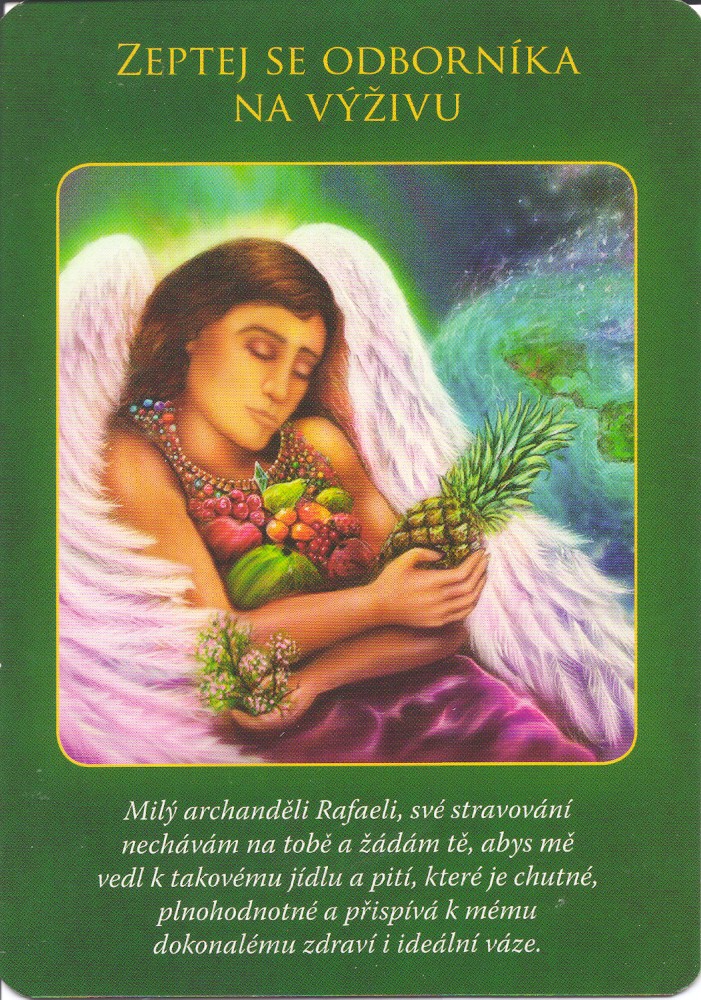 Milý archanděli Rafaeli, své stravování nechávám na tobě a žádám tě, abys mě vedl k takovému jídlu a pití, které je chutné, plnohodnotné a přispívá k mému dokonalému zdraví i ideální váze.