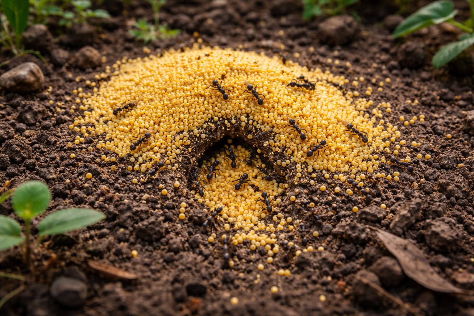 Kasza jaglana ma niekonwencjonalny wpływ na owady, zmieniając się z nieszkodliwego produktu w potężne narzędzie do oczyszczania terenu. Szkodniki ogrodowe mylą małe żółte ziarna z jajami macicy ze względu na podobieństwo wizualne i dotykowe. Robotnice aktywnie przenoszą je w głąb mrowiska. Po wejściu do gniazda kasza intensywnie pęcznieje od wilgoci z gleby, fizycznie blokując podziemne przejścia. Ponadto owady nie są w stanie strawić spęczniałej skrobi, co prowadzi do śmierci kolonii podczas próby spożycia zapasów.