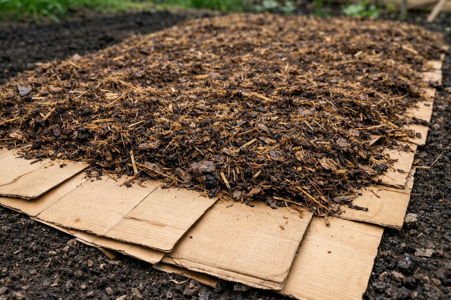 Lepiej jest wybrać zwykłą brązową tekturę falistą bez błyszczącej folii, aby uniknąć niepotrzebnych związków chemicznych w ziemi.