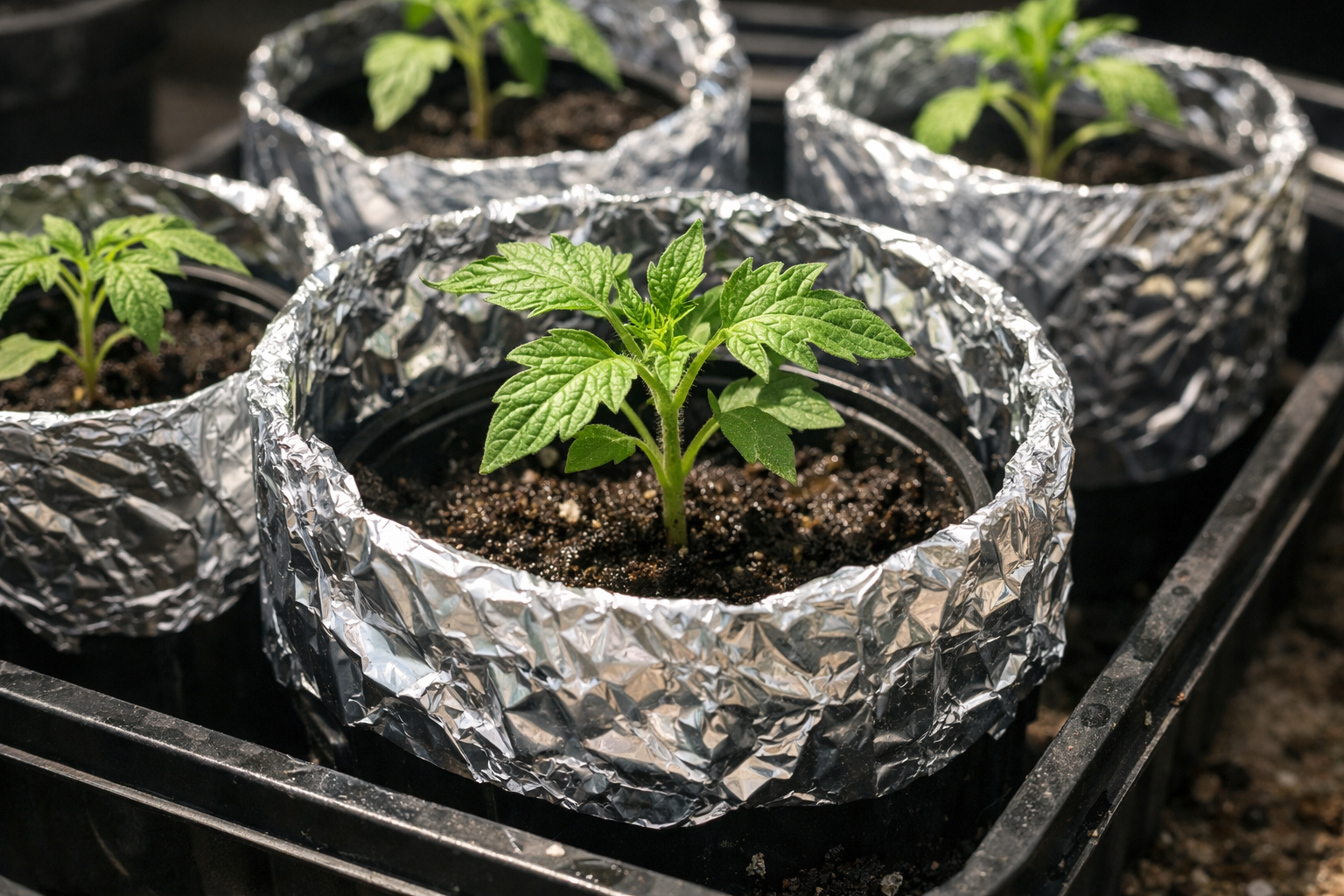 Moją osobistą wypróbowaną i sprawdzoną sztuczką przeciwko przegrzewaniu się korzeni na południowych oknach jest szczelne owinięcie plastikowych kubków zwykłą folią spożywczą błyszczącą stroną na zewnątrz.