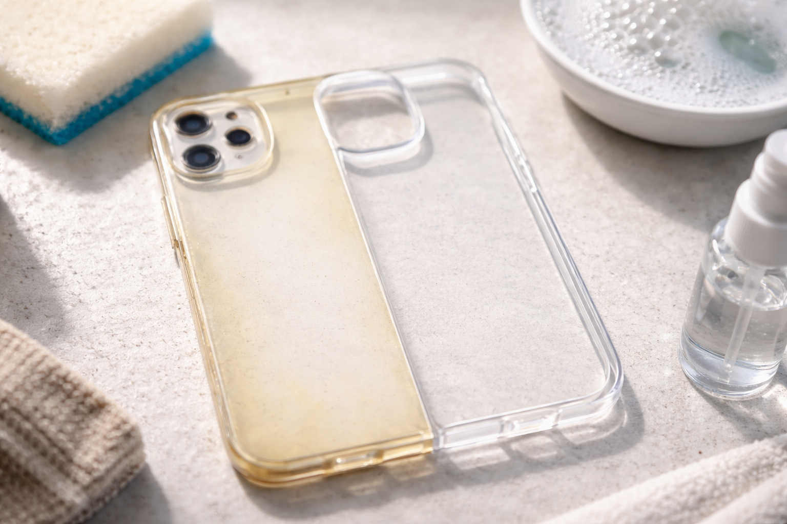Każdy posiadacz smartfona boryka się z tym irytującym problemem – przezroczyste lub w jasnym kolorze etui po krótkim czasie traci swój wygląd, pokrywając się brudnymi plamami i żółknąc. Mnie również męczy ciągłe zmienianie ochrony na telefon, dlatego dogłębnie poznałem chemiczne przyczyny tego zjawiska i znalazłem sprawdzony, działający sposób na przywrócenie materiałowi nieskazitelnej czystości bez szkody dla jego struktury.