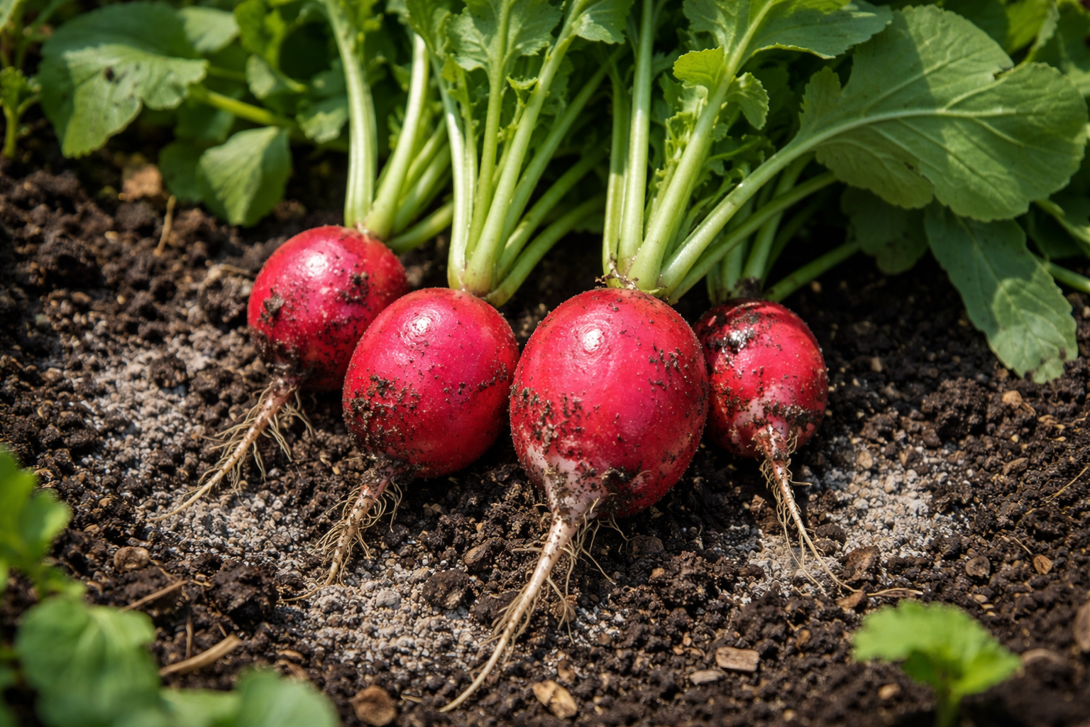 Rzodkiewki uwielbiają luźną glebę. Zamiast nawozu mineralnego używam zwykłego nawozu popiół drzewny. Nie tylko odżywia roślinę potasem i fosforem, ale także odtlenia glebę, co ma kluczowe znaczenie dla tej uprawy.