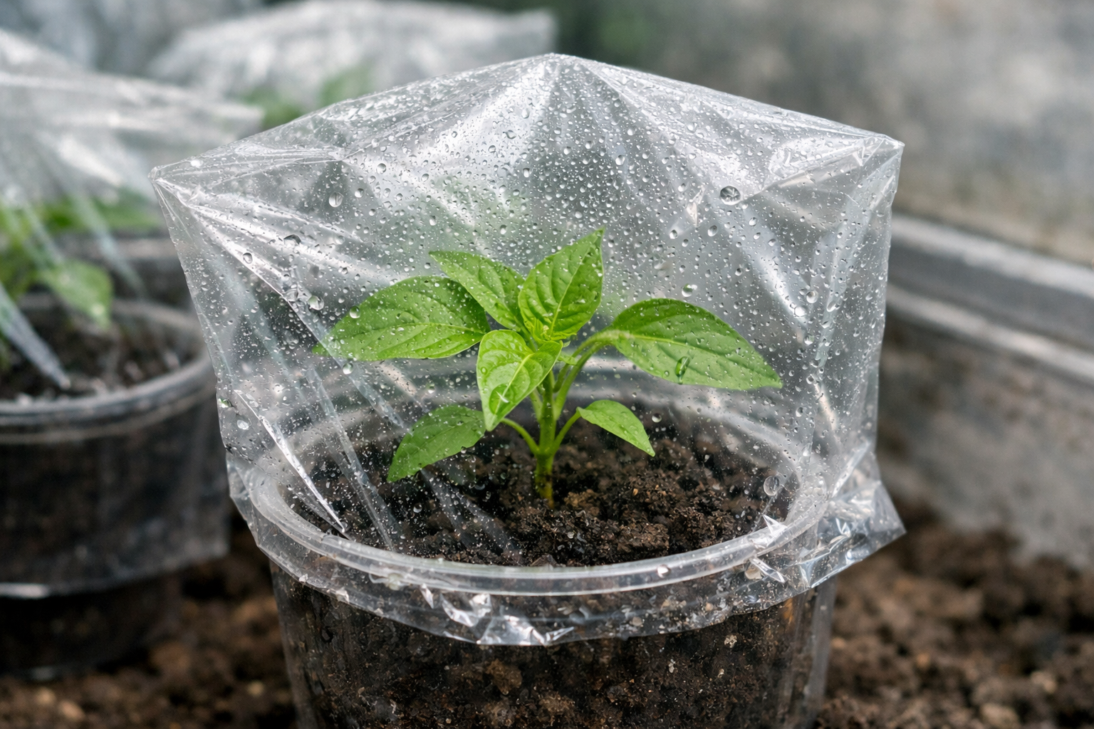 Głównym sekretem szybkiego wzrostu jest zbudowanie mini szklarni z przezroczystej folii nad każdym słabym krzakiem, co natychmiast zmniejsza parowanie wilgoci z powierzchni liści.