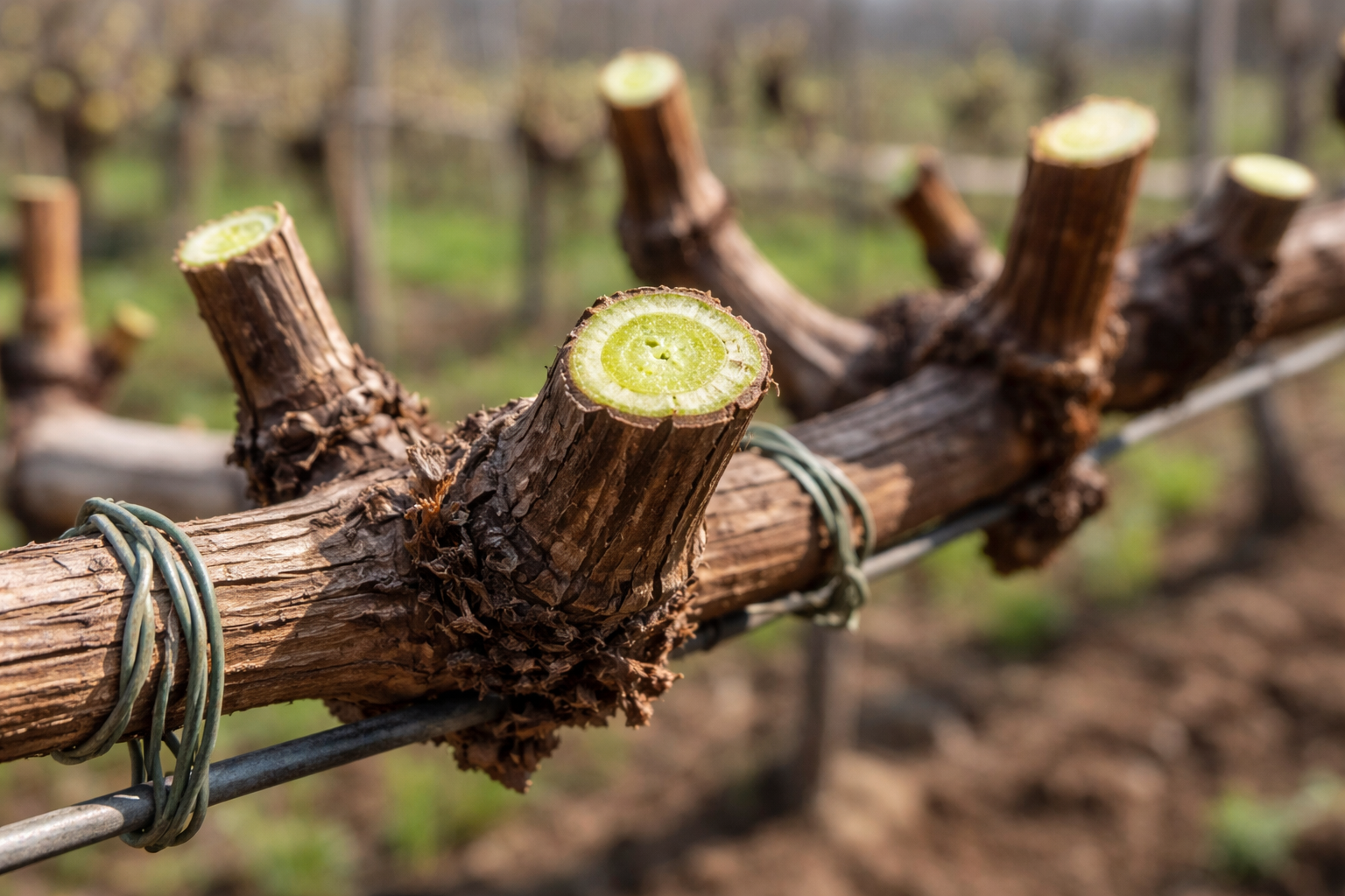 Natychmiast przerwij proces przerzedzania i mocno pociągnij winorośl miękkim drutem tuż poniżej rany, aż sok przestanie wypływać.