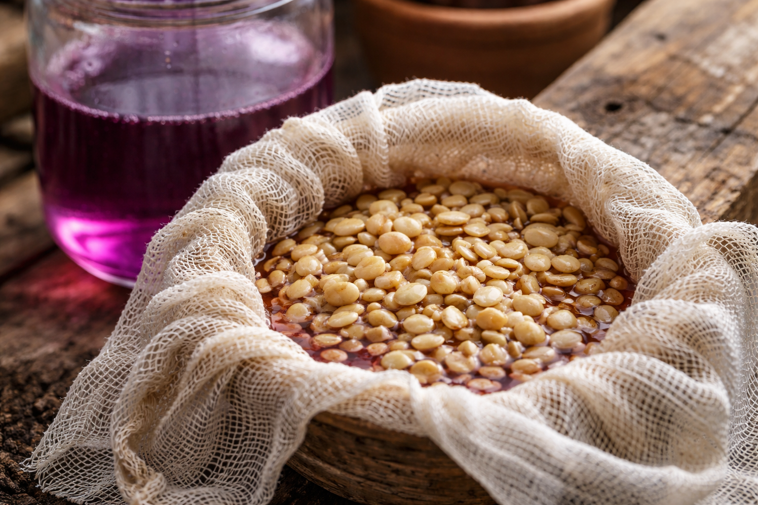 Zanurzyć woreczek z gazy z nasionami w świeżo przygotowanej roztwór manganu