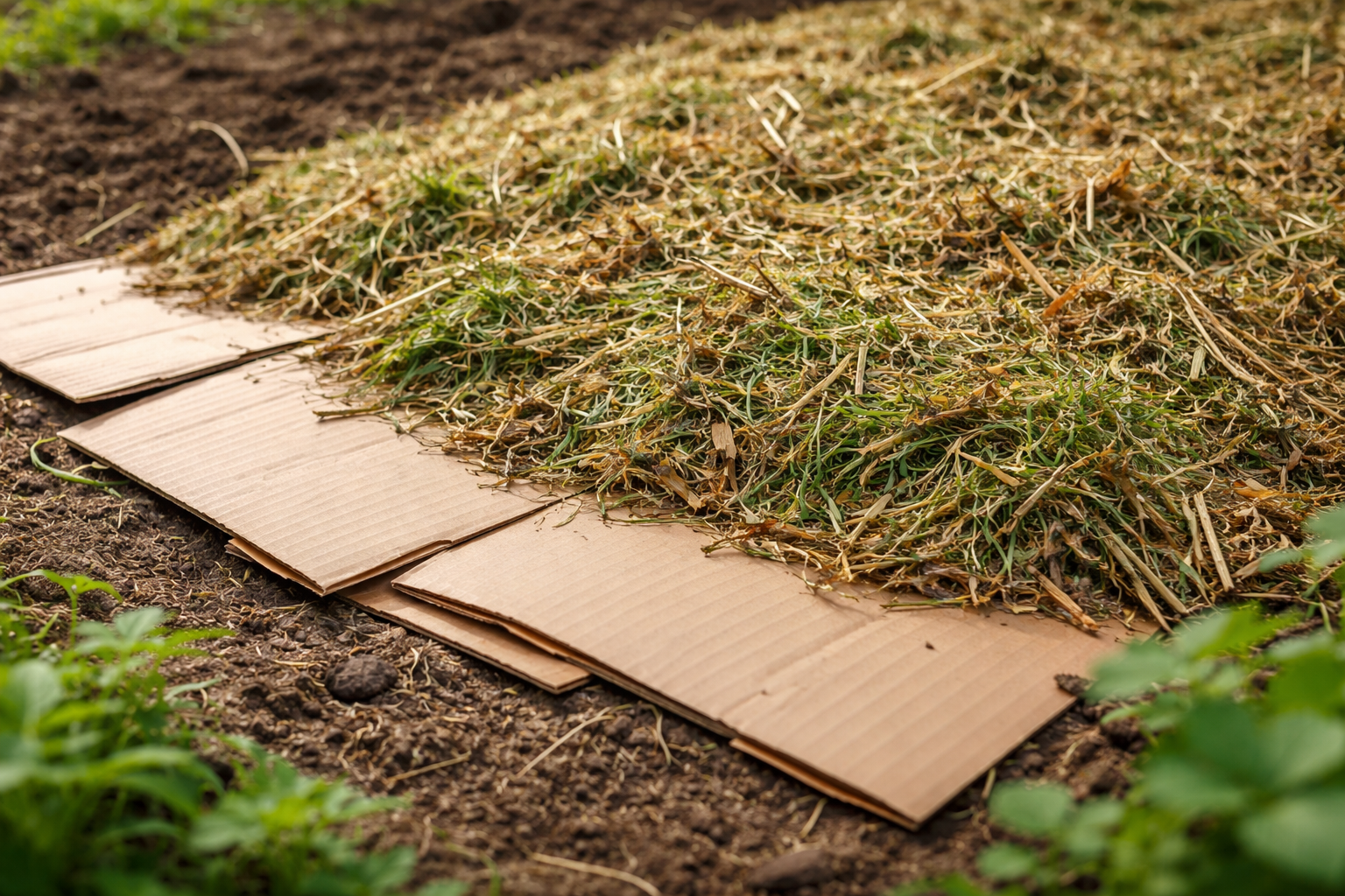 Ułóż arkusze zwykłej tektury falistej bez taśmy ściśle nad obszarem chwastów.