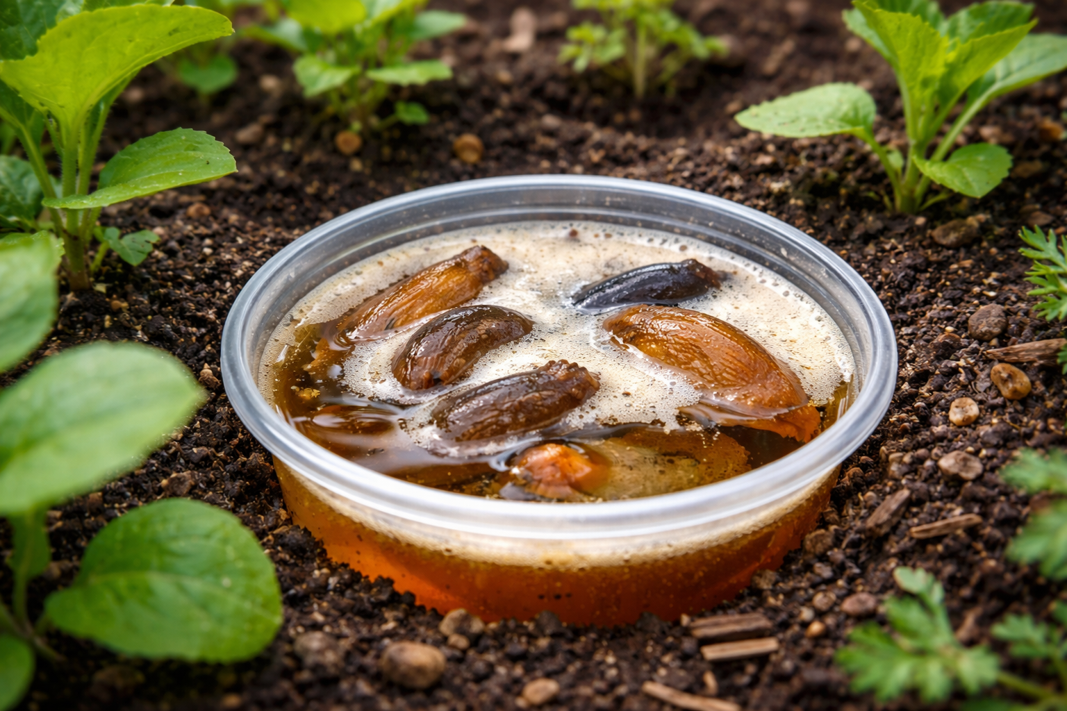 Ważna wskazówka: wykop plastikowe kubki z płynem tak, aby ich krawędzie wystawały kilka centymetrów nad ziemię, w przeciwnym razie pożyteczne chrząszcze, które są naturalnymi wrogami ślimaków, przypadkowo wpadną do przynęty.