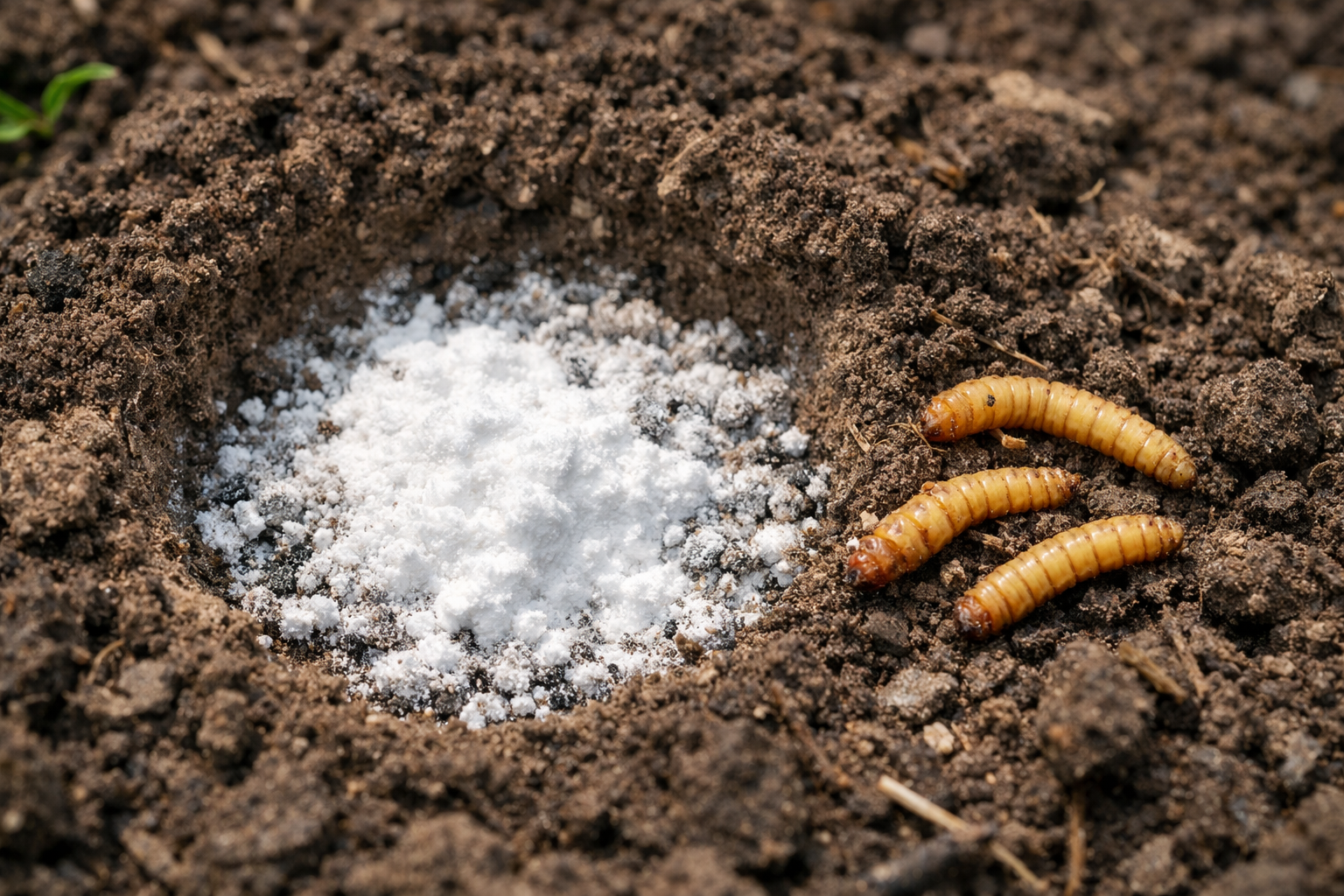 Główny sekret sukcesu tkwi w miejscowym stosowaniu suchego proszku bezpośrednio na korzenie roślin, co tworzy barierę alkaliczną nie do pokonania dla przemieszczania się larw w górnych warstwach gleby.
