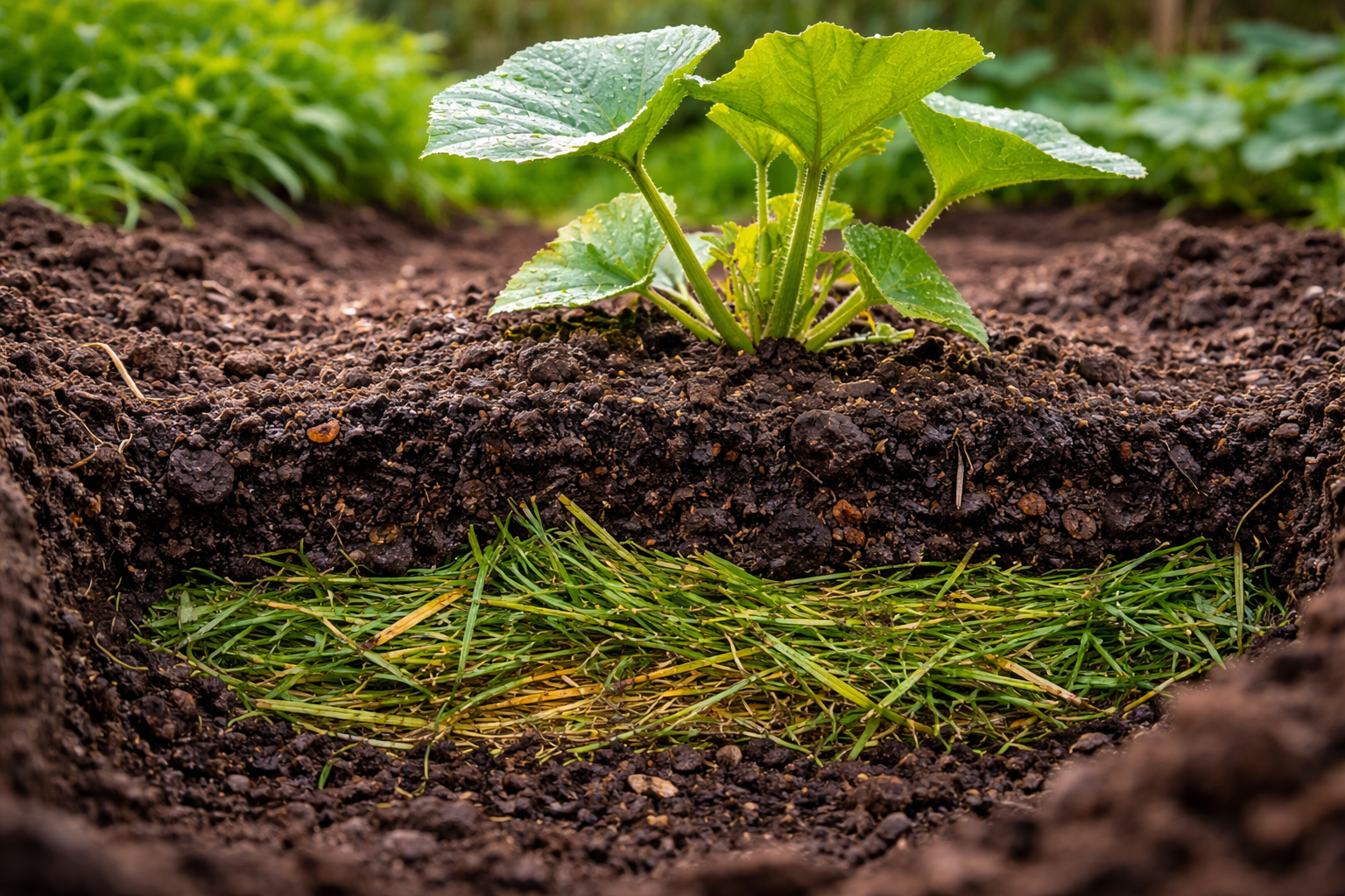 Głównym sekretem szybkiego startu jest dodanie świeżo ściętej trawy na dno dołu do sadzenia, która po rozłożeniu działa jak potężny naturalny akumulator.