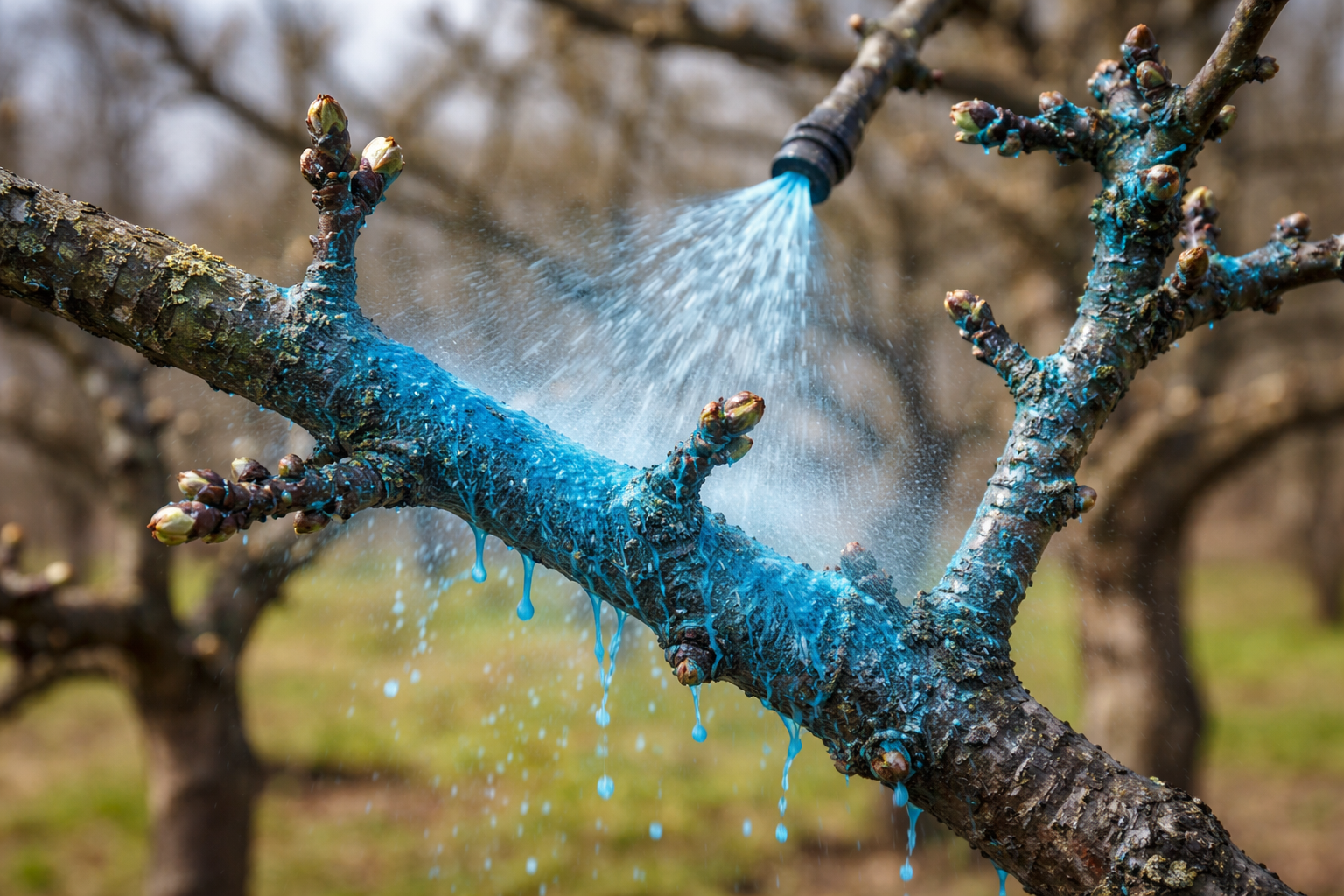 Główna tajemnica skuteczności tkwi w odpowiednim czasie zabiegu – drzewa powinny być opryskiwane ściśle przed pączkowaniem, na uśpionych drzewach.